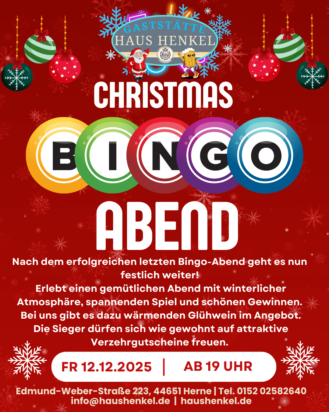Freut euch auf einen Abend voller Spaß, Spiel und Gewinne. Im Angebot: zwei verschiedene Cocktails zum Sonderpreis – den ganzen Abend. Gewinner erhalten Verzehrgutscheine. Bingokarten sind für 1 € beim Wirt oder bei der Wirtin erhältlich.